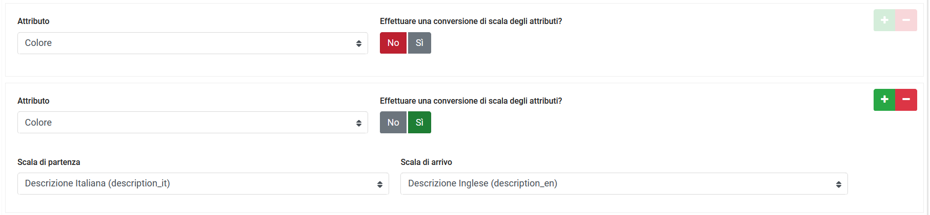 - Aggiungere un nuovo attributo, selezionando nuovamente l'attributo "Colore", questa volta attivando la conversione di scala e selezionando le scale utilizzate per la traduzione (che devono essere obbligatoriamente di tipologia "Translate", o la traduzione non avrà effetto)