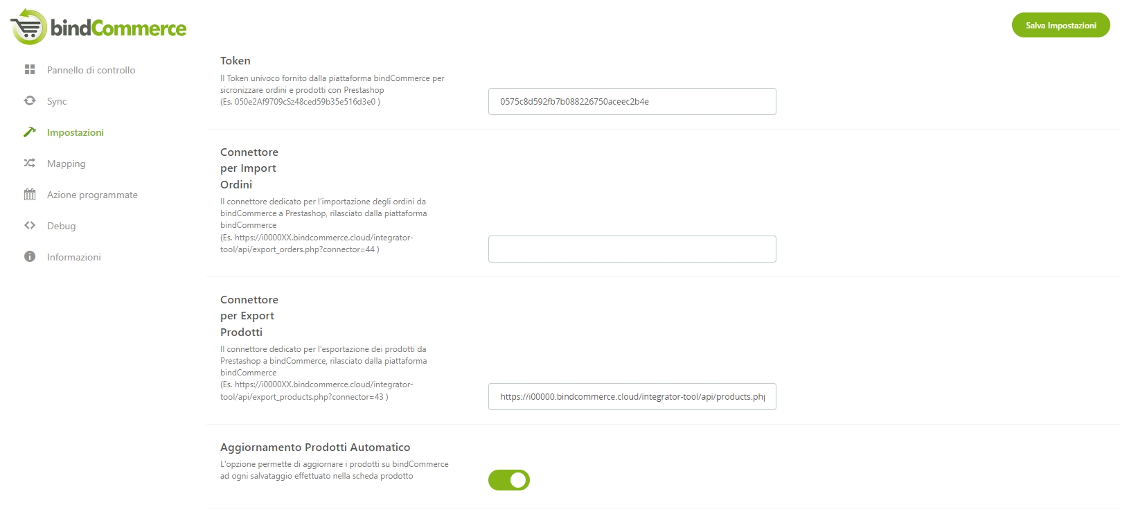 Infine inserire il token ottenuto durante la creazione del nodo e l'URL generato durante la creazione del connettore di import prodotti negli appositi campi nelle impostazioni del modulo PrestaShop: