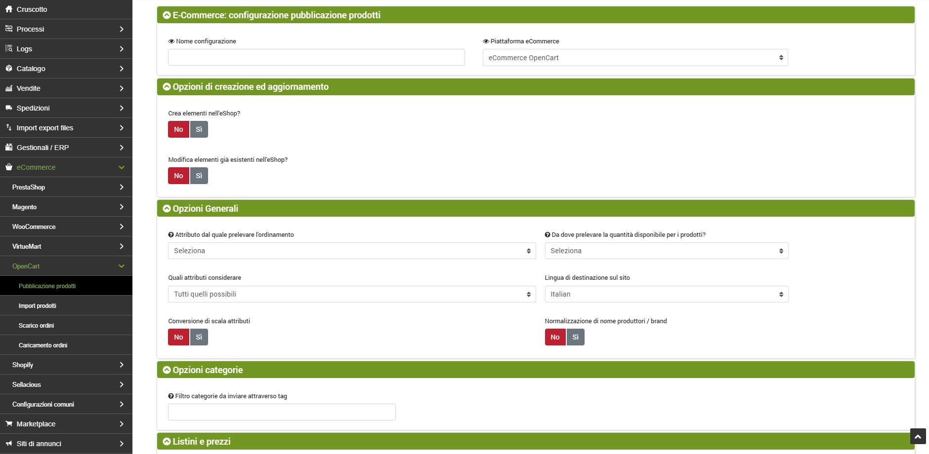 Per creare una configurazione apposita da applicare al connettore che si occuperà di pubblicare i prodotti su OpenCart bisogna recarsi nel menu: