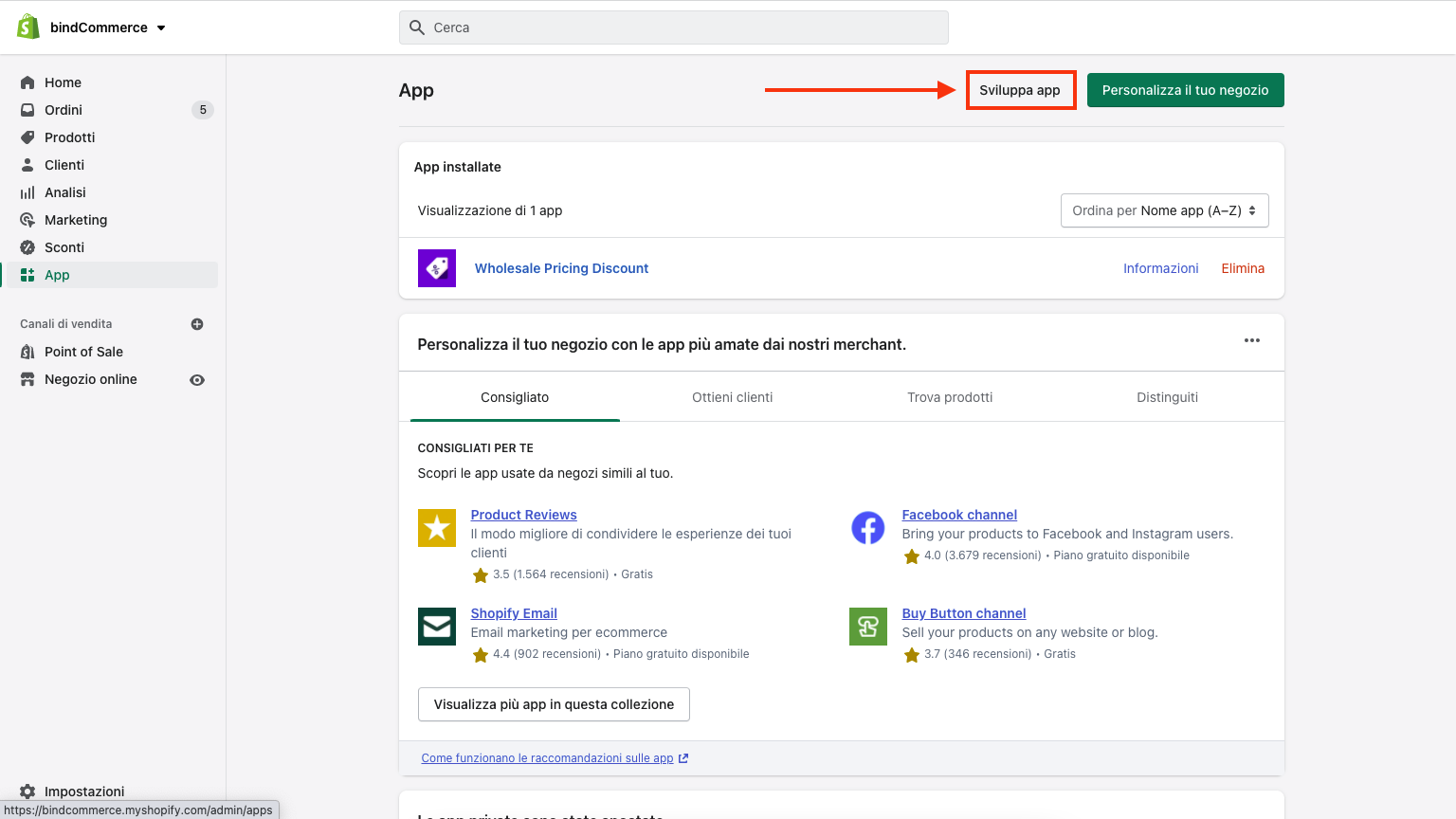 La prima operazione da eseguire per rendere possibile la comunicazione fra il proprio sito Shopify e bindCommerce è il recupero della chiave e della password API.
