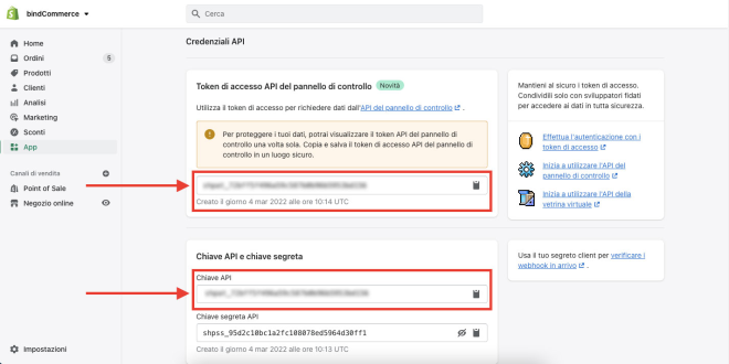 Dopo aver installato l’app, compariranno i campi da riportare all’interno del nodo Shopify in bindCommerce, precisamente Token di accesso API del pannello di controllo e Chiave API.
