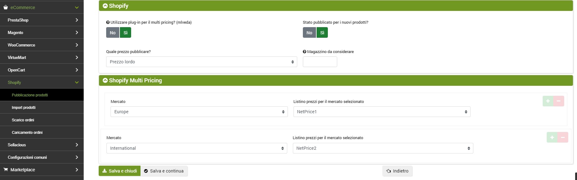 Multi Country Pricing di Mlveda consente di applicare prezzi diversi anche a prodotti con varianti. Il plugin si integra con bindCommerce, grazie ad un'apposita funzione che rientra tra le opzioni Premium. La funzione presente su bindCommerce consente di scegliere se usare o no questo specifico plugin, quale prezzo pubblicare tra netto o lordo, e infine per ogni mercato a cui è destinata la vendita dei prodotti è possibile selezionare un listino specifico.
