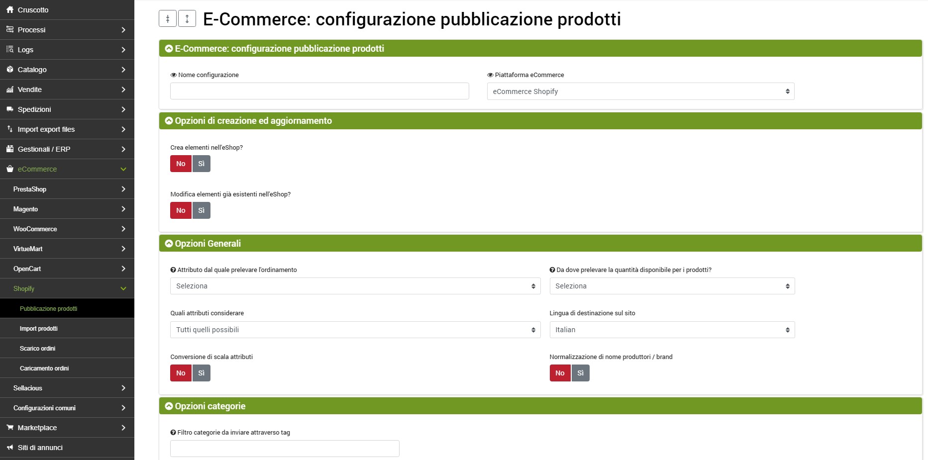 Questa sezione raccoglie una serie di opzioni specifiche per Shopify:
