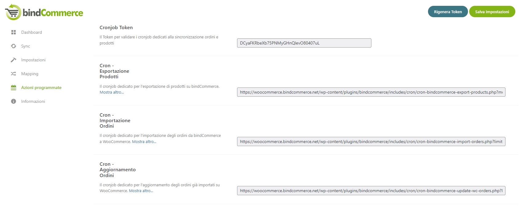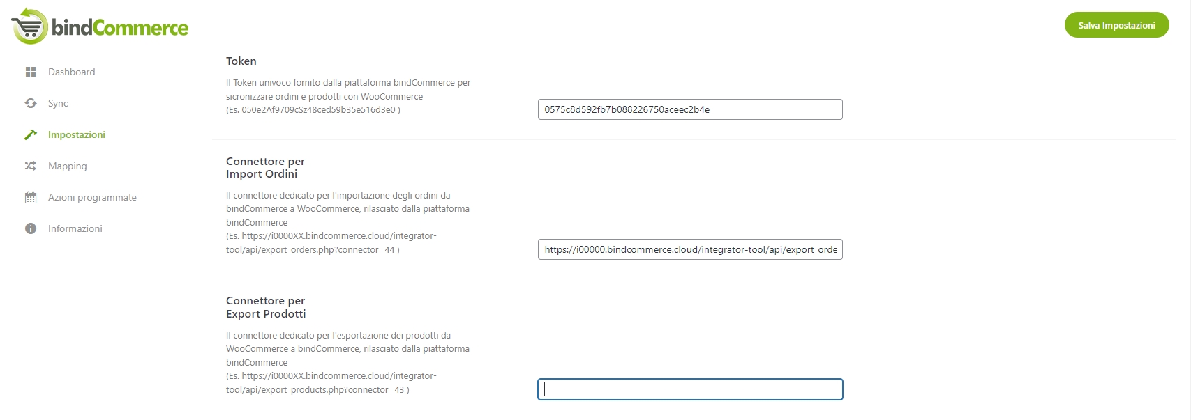 Infine inserire il token ottenuto durante la creazione del nodo e l'URL generato durante la creazione del connettore di export ordini negli appositi campi nelle impostazioni del plugin WordPress: