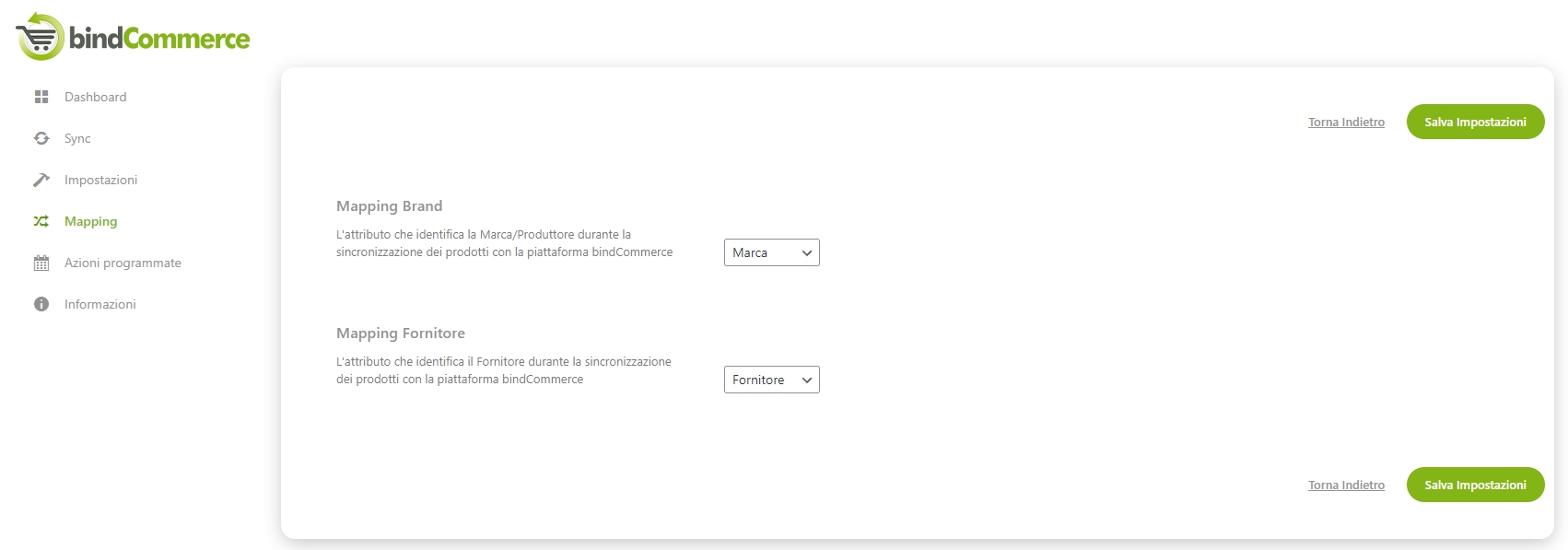 Nella sezione Mapping >> Export Prodotti è possibile selezionare quali attributi dei prodotti presenti in WooCommerce debbano essere copiati per popolare i campi Marca e Fornitore in bindCommerce.