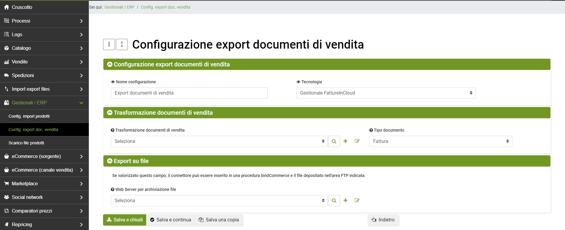 Per creare la configurazione di export dei documenti di vendita da bindCommerce verso Fatture in Cloud recarsi al menù:
