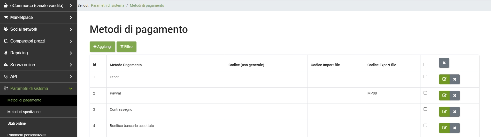 Parametri di sistema >> Metodi di pagamento