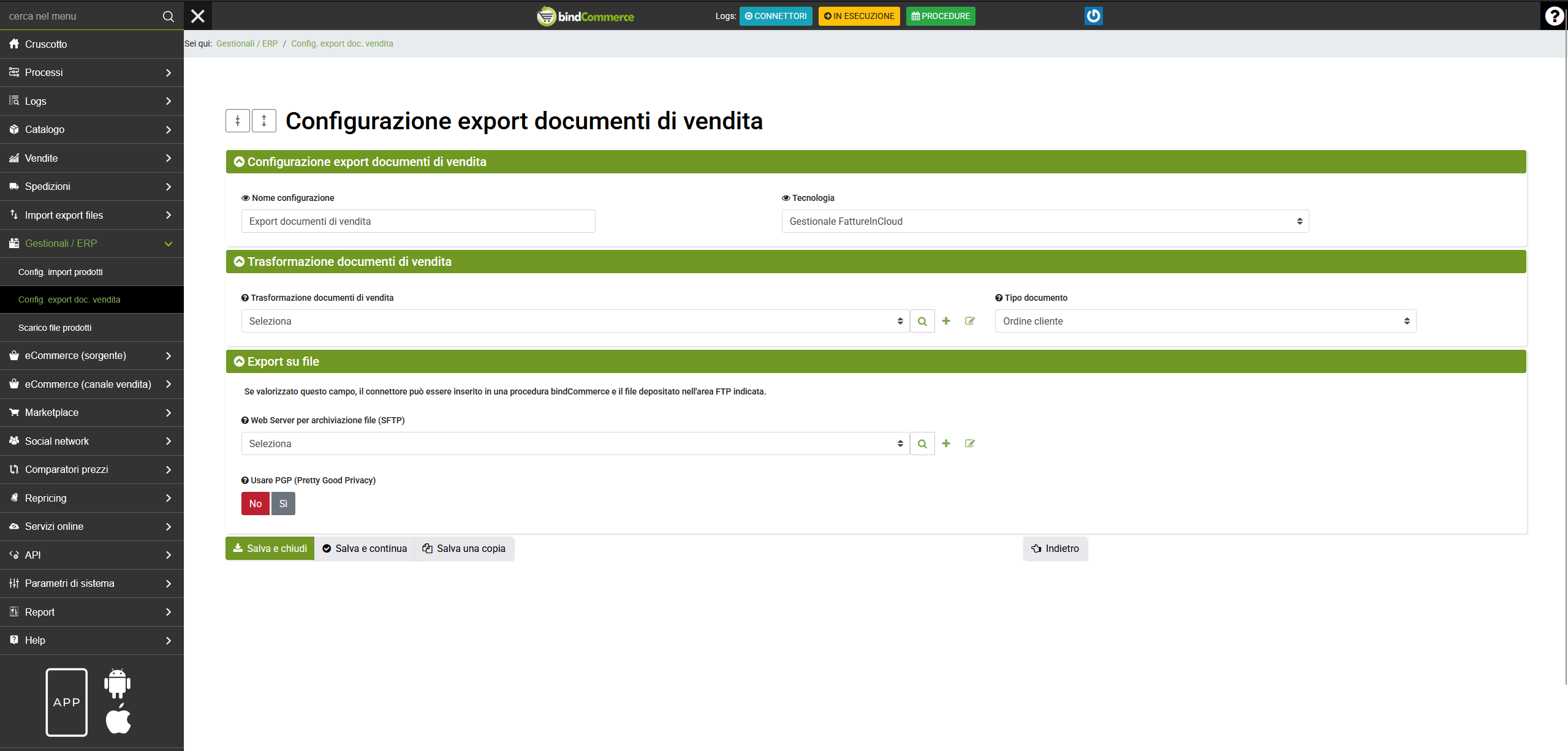 Per creare la configurazione di scarico ordini da bindCommerce verso Fatture in Cloud andare al menù