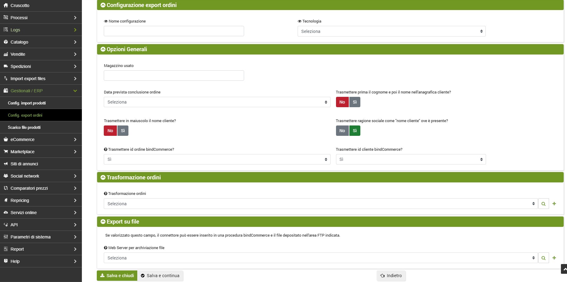 Per creare la configurazione dal pannello di controllo bindCommerce andare al menù: