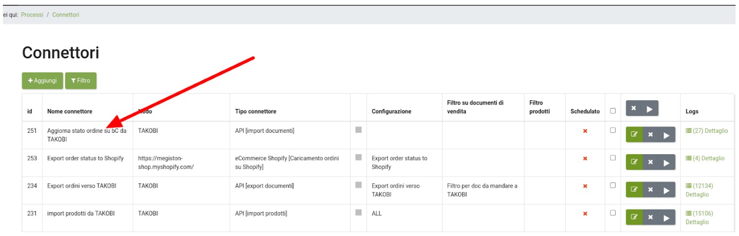 - Nome connettore: scegliere il nome che si ritiene più adeguato per distinguere il nodo (ad esempio Aggiorna stato ordini da TAKOBI)