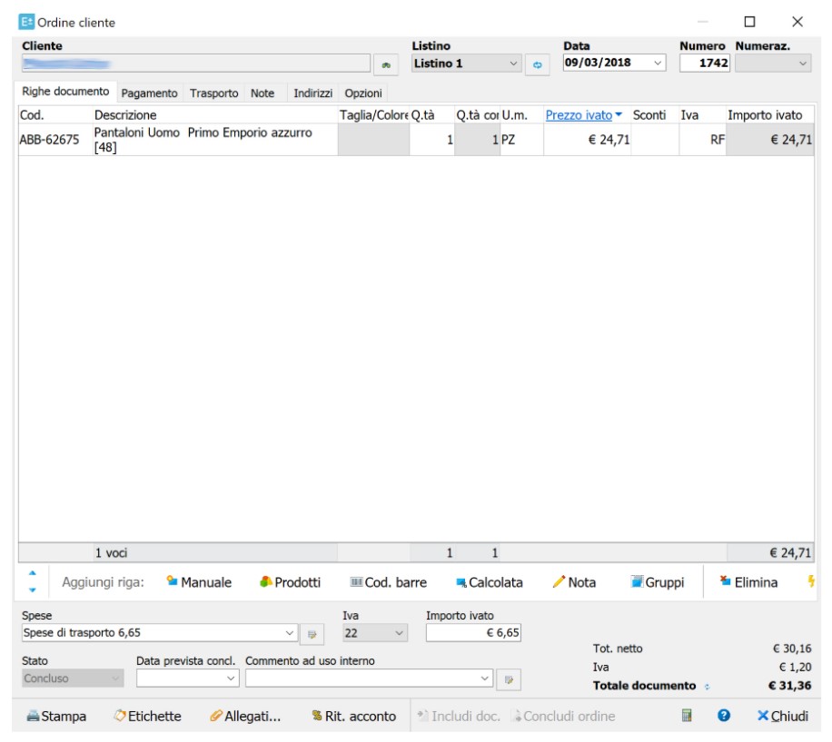 Per ogni ordine, bindCommerce acquisisce sul proprio database la modalità di spedizione, spese di spedizione ed eventualmente quelle di incasso (es. per contrassegno). Durante la fase di scarico ordini la somma delle spese viene inserita nel campo "Spese" e la descrizione dettagliata delle stesse nel campo descrittivo associato. Vengono altresì scaricate le modalità di trasporto e di pagamento scelte ed inserite nelle relative sezioni dell'ordine (tab Pagamento e tab Trasporto).