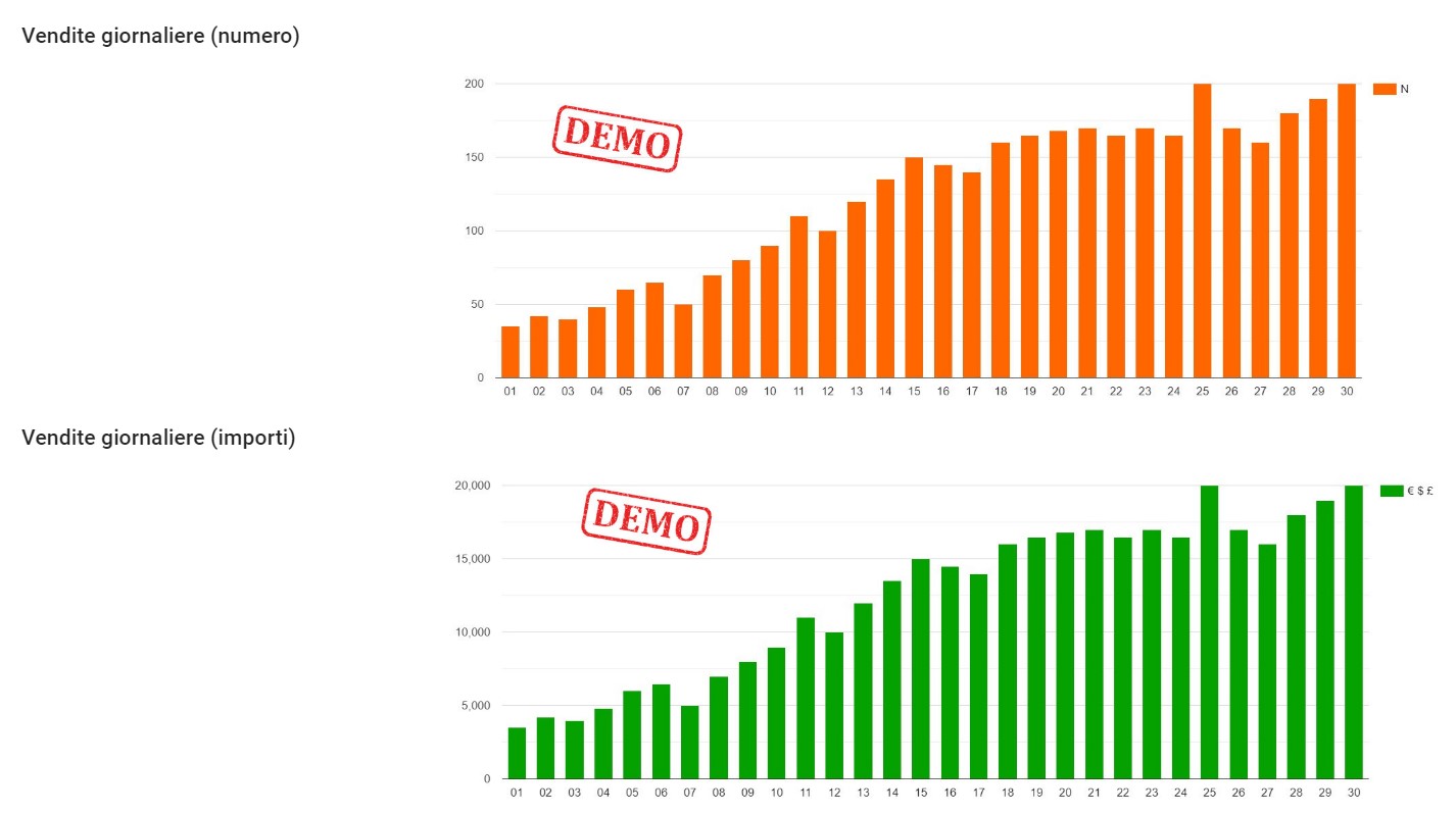 I 2 report “Vendite mensili” e “Vendite giornaliere” offrono una panoramica sull’evoluzione delle vendite nel tempo, con un dettaglio a livello giornaliero o mensile.