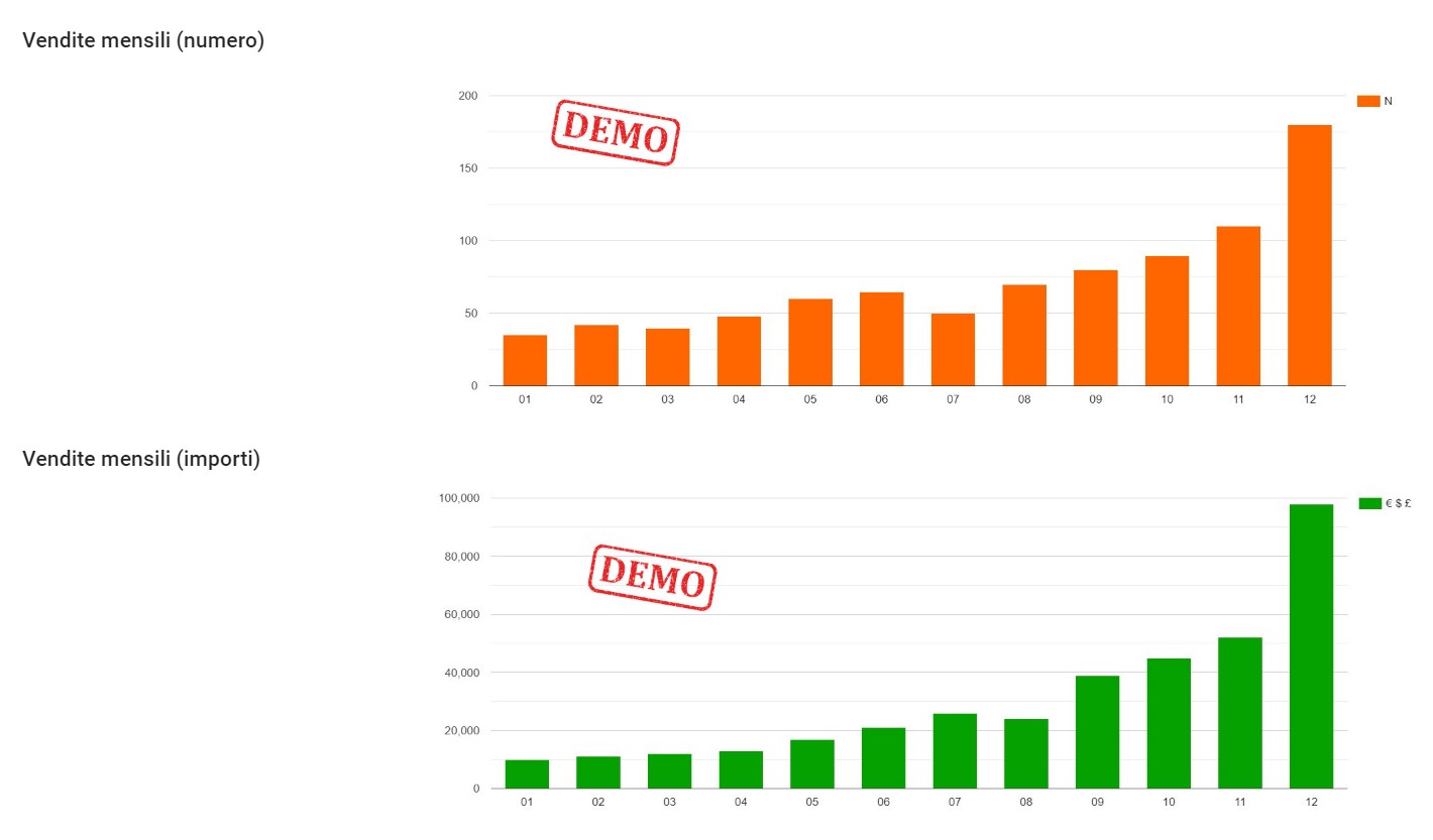 Il report “Ordini per canale di vendita” offre una fotografia relativa ad un periodo determinato (ad esempio l’ultimo mese), mentre il report “Vendite mensili per canale” permette di osservare l’andamento delle vendite nel tempo, filtrando su un particolare canale di vendita.